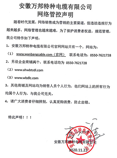 鄭重聲明:安徽萬邦特種電纜有限公司官方網站為:www_wanbangcable_com.ncxyyhq.com,除此之外無任何子網站或合作網站,其余均為假冒偽劣。電話:0550-7621728 13485756353 地 址:安徽省天長市滁州高新技術產業開發區經四路29號